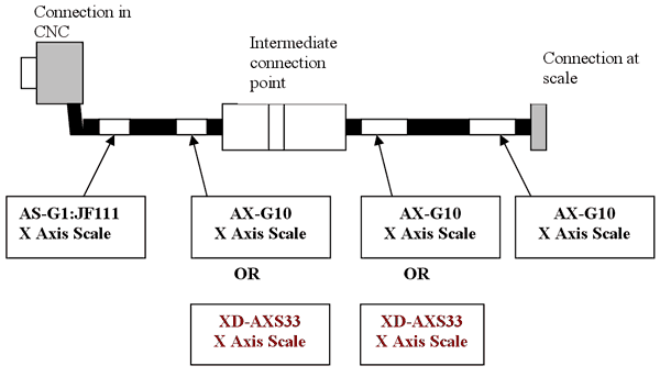 When an intermediate connection point is not specified, label the intermediate connection point according to the function group and device at the machine end (AX-G10). If the intermediate connection point is specified use the specified designation (XD-AXS33). Label the machine end (AX-G10) and control end (AS-G1:JF111) of the cables according to their connection points.