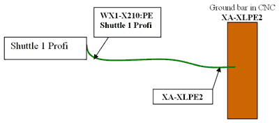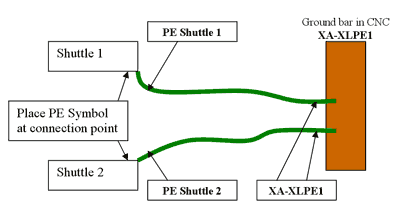 Use a round PE symbol to mark all PE connection points. Label CNC end connections according to their connection point (XA-XLPE2). Label machine end connections using the function group – Device : connection point (WX1-X210:PE). Description text may be used to facilitate wiring at Fives or in the field (Shuttle 1 Profi). Low & High voltage grounds must be connected to the appropriate ground bars in the CNC.